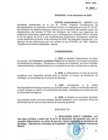 Decreto Sección 2da.9921, de fecha 19 de diciembre de 2025, sobre «Declaración de Duelo Comunal»